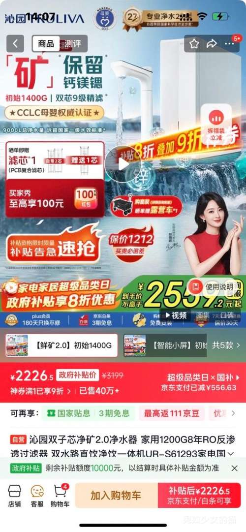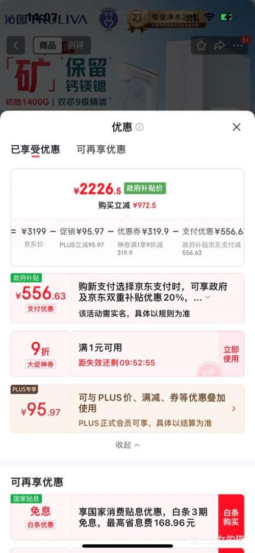 商品到手价2226.5元(种草最高再返100元,需领券),根据小编提供的优惠信息(满1元,打9折+家电-政府补贴15%/20%-部分地区可领),下单1件。好价不错过,感兴趣的朋友可以试试!
