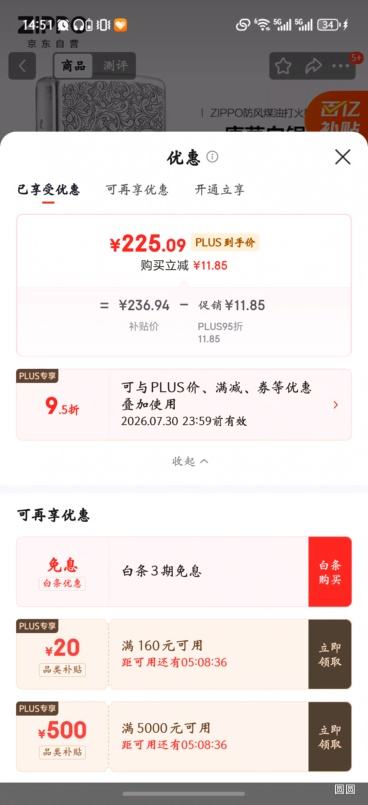 商品到手价205.09元,根据小编提供的优惠信息(plus 限时加码好券160-20/5000-500/2000-200/480-60),下单1件。好价不错过,感兴趣的朋友可以试试!