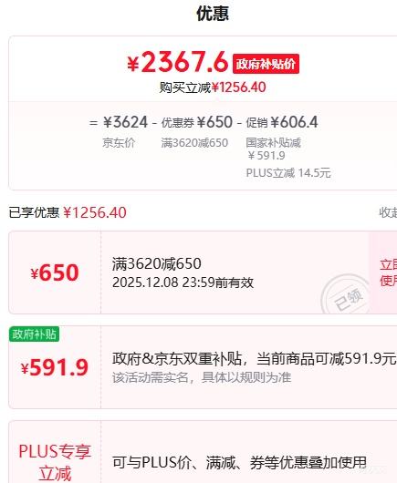 商品到手价2367.6元(需领券),根据小编提供的优惠信息(满2000减180+650元优惠券+家电-政府补贴15%/20%-部分地区可领),下单1件。好价不错过,感兴趣的朋友可以试试!