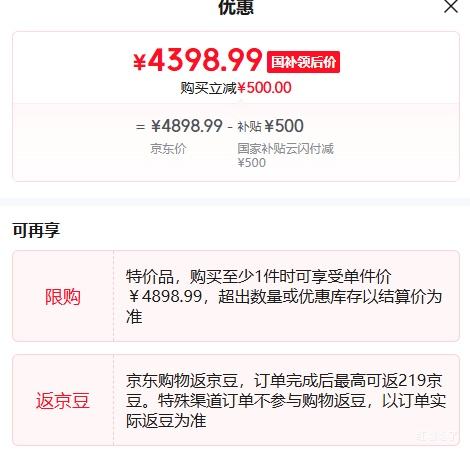 商品到手价4398.99元,根据小编提供的优惠信息(3C-政府补贴15%/20%--部分地区可领),下单1件。好价不错过,感兴趣的朋友可以试试!