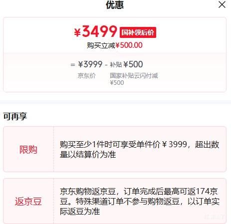 商品到手价3499元包邮,根据小编提供的优惠信息(3C-政府补贴15%/20%--部分地区可领),下单1件。好价不错过,感兴趣的朋友可以试试!