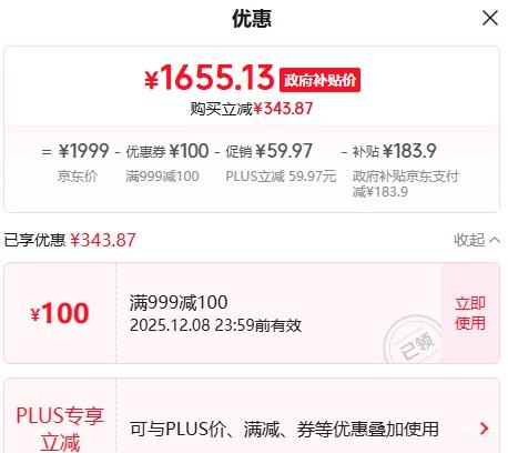 商品到手价1655.13元,根据小编提供的优惠信息(家电-政府补贴15%/20%-部分地区可领+满999减100元优惠券),下单1件。好价不错过,感兴趣的朋友可以试试!