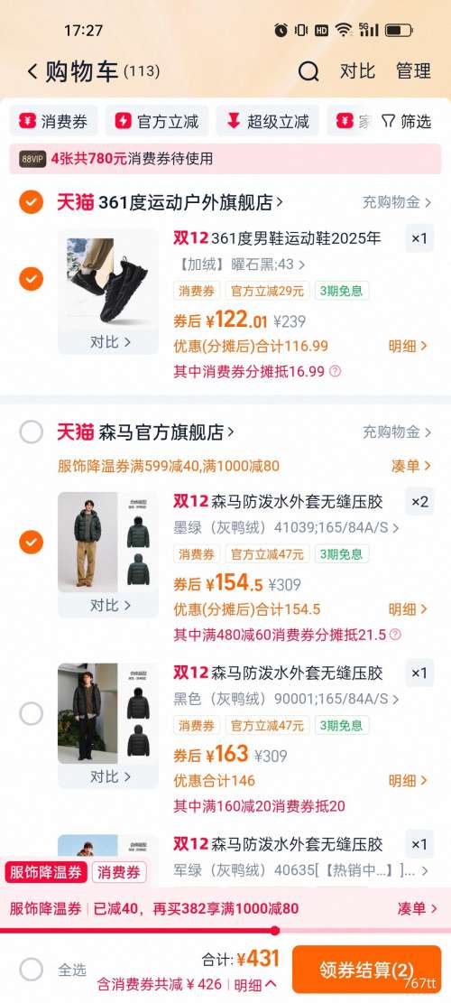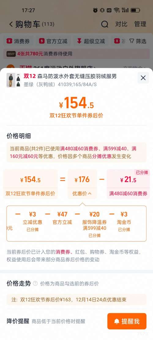商品到手价154.5元(需拍两件+凑单 ,共431元),根据小编提供的优惠信息(优惠券+满160减60+88vip 双12 88折/9折 780元消费券 至高抵(20/60/200/500)+服饰降温券 满599减40+如何使用淘金币+凑单品),下单2件。好价不错过,感兴趣的朋友可以试试!