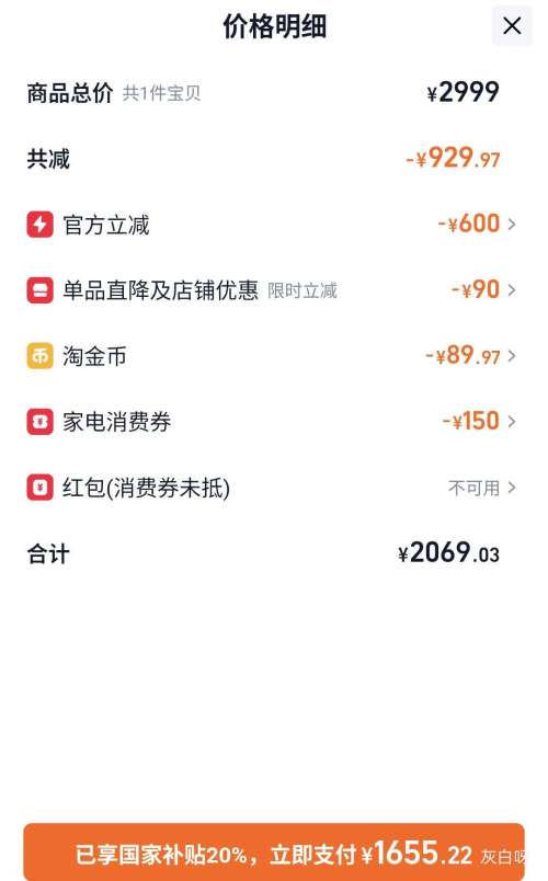 商品到手价1655.22元,根据小编提供的优惠信息(优惠券+如何使用淘金币抵扣 89.97元+88vip 双十二家电消费券 (1500-150/3000-300/5000-500)+家电-政府补贴15%/20%--部分地区可领),下单1件。好价不错过,感兴趣的朋友可以试试!
