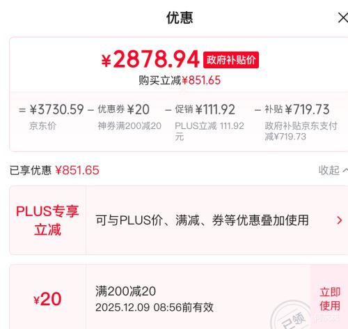 商品到手价2878.94元,根据小编提供的优惠信息(家电-政府补贴15%/20%-部分地区可领+ 双12主会场 惊喜红包 200-20*6张),下单1件。好价不错过,感兴趣的朋友可以试试!