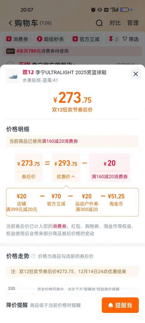 商品到手价273.75元+51.25元淘金币(需领券,直播间限时抢购),根据小编提供的优惠信息(优惠券+满499减40+运动户外券 满300减20+88vip 双12 88折/9折 780元消费券 至高抵(20/60/200/500)+如何使用淘金币+慢津贴1元),下单1件。好价不错过,感兴趣的朋友可以试试!
