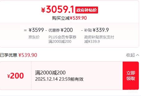 商品到手价2999.1元(非国补,晒单返60元京豆后),根据小编提供的优惠信息(满2000减180+plus 双十二限时加码好券160-20/5000-500/2000-200/480-60+3C-政府补贴15%/20%--部分地区可领),下单1件。好价不错过,感兴趣的朋友可以试试!
