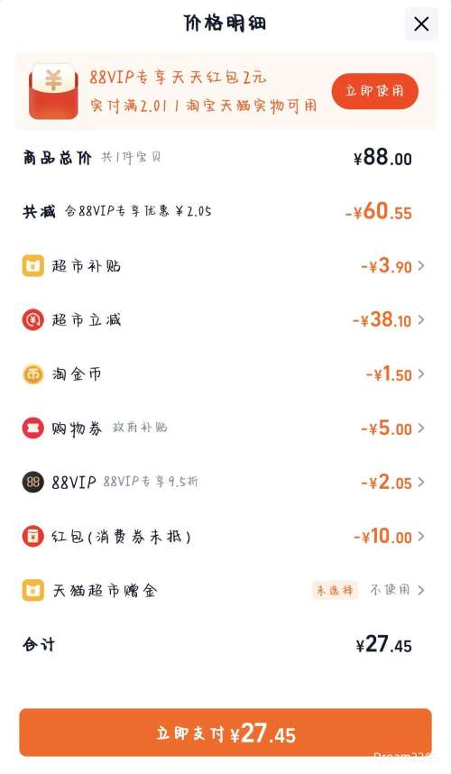 商品到手价27.45元(需领券,10-8红包后19.45元,叠加全能卡红包到手更低),根据小编提供的优惠信息(优惠券+满88减5(详情页)+如何使用淘金币抵扣1.5元),下单1件。好价不错过,感兴趣的朋友可以试试!