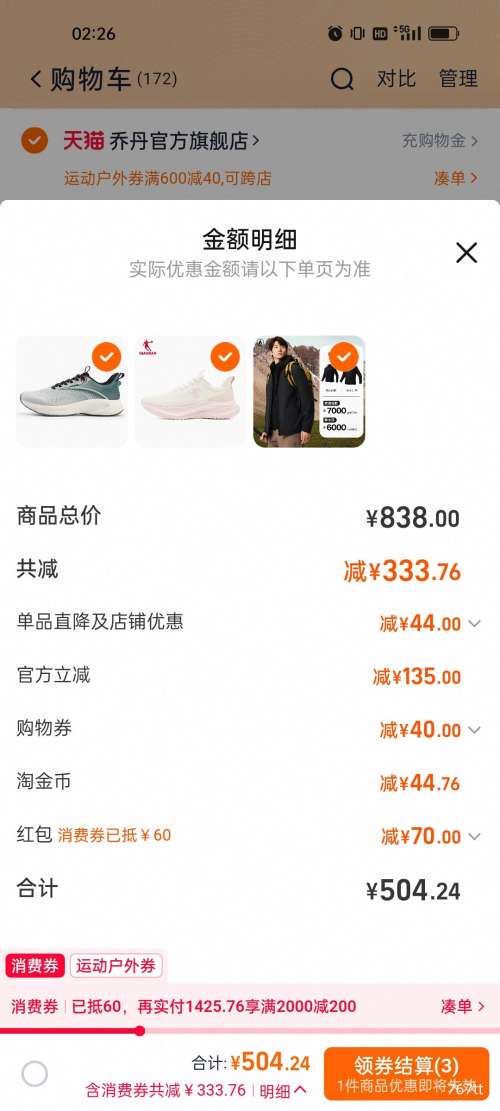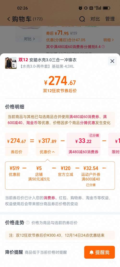 商品到手价284.67元(限时补贴后274.67元),根据小编提供的优惠信息(优惠券+88vip 双12 88折/9折 780元消费券 至高抵(20/60/200/500)+运动户外券 满600减40元+如何使用淘金币+凑单品+凑单品),下单1件。好价不错过,感兴趣的朋友可以试试!