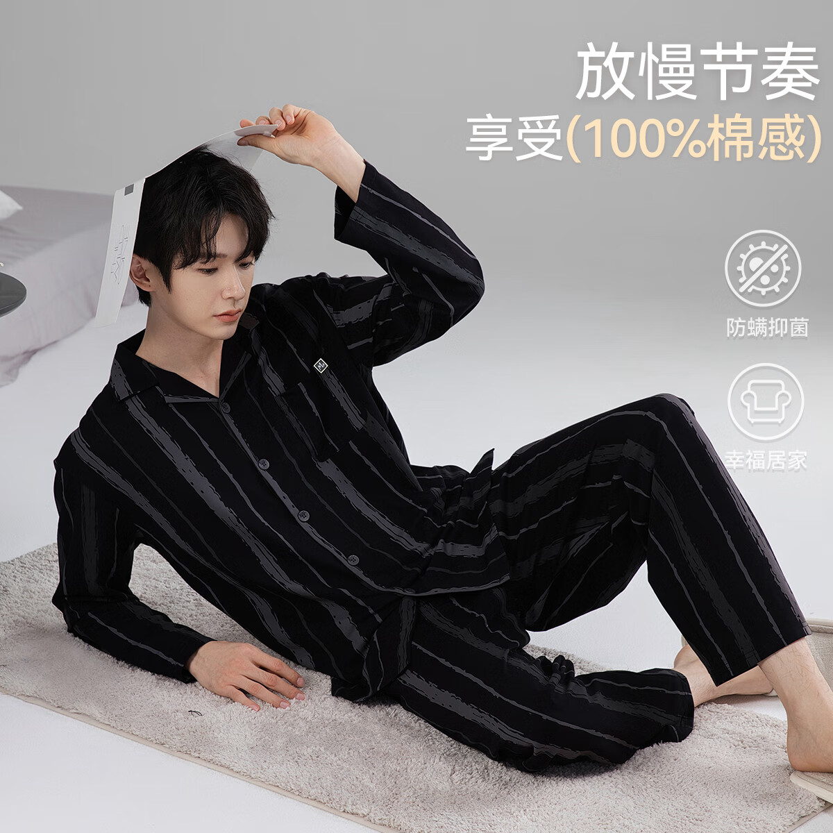 京东自营MiiOW 猫人 男士睡衣 100%纯棉 抑菌春秋条纹长袖 可外穿家居服