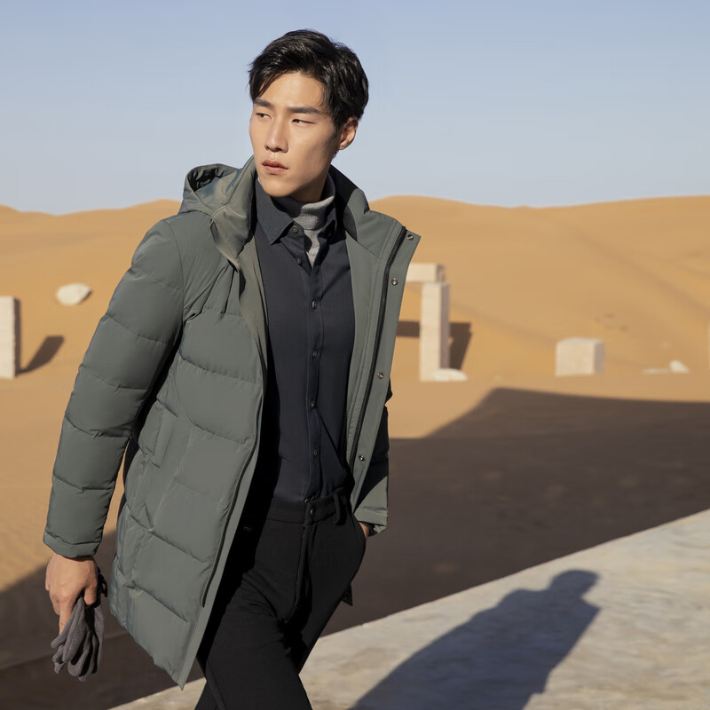 京东商城需首单、PLUS:YOUNGOR 雅戈尔 羽绒服男立领连帽长款 锦纶氨纶 绿色 L 175/96A